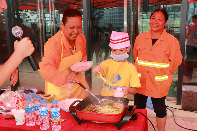 搶答活動結束之后,進入“小廚神”廚藝大比拼環節。由園林綠化工人、水電維修物業工人、保潔人員等進城務工人員組成的5組家庭展開了激烈的廚藝大比拼競賽。看,小廚神們在父母的指導下井井有條地備菜、炒菜、起鍋,忙得不亦樂乎。各色菜式色香味俱全,充分展現了孩子們“小當家”的本領。半小時后,小廚神們在大家的熱烈掌聲中完成了比賽菜品,廚藝大師及現場觀眾根據完成的速度、菜品、味道等評出廚藝大賽一等獎1名,二等獎2名,三等獎3名,優秀獎10名。