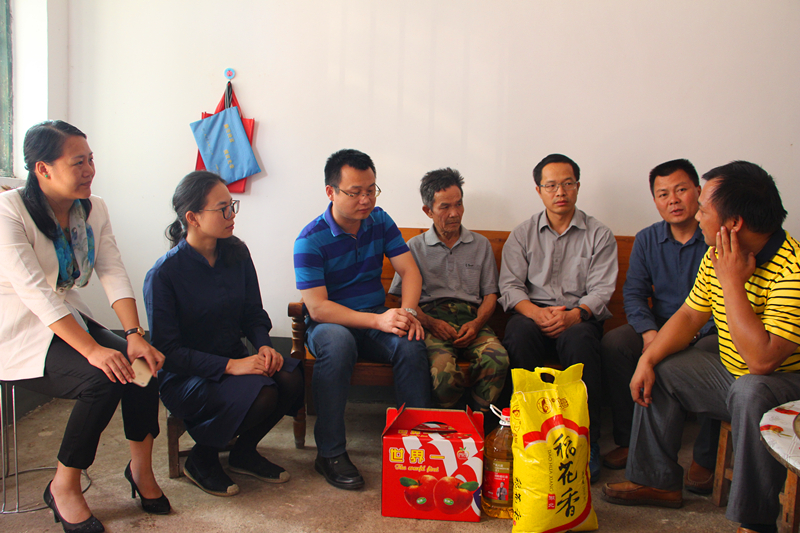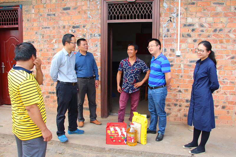 座談會結束后,在那樓鎮陸文威書記的陪同下,龔國強董事長一行先后來到貧困戶盧創興和梁蔭坎家里開展入戶慰問工作。在盧創興家里,龔董事長緊緊握住盧創興老人的手,詳細地了解盧創興家庭情況,當了解到盧創興家通過轉移勞動力的方式,增加創收途徑,實現脫貧的時候,龔董事長頻頻點頭。在貧困戶梁蔭坎家里,董事長了解到他通過發展種養,憑著農村人樸實無華的特質,種養產品不僅獲得豐收且供不應求的時候,董事長給他豎起了大拇指,鼓勵他繼續擴大生產規模,早日實現小康生活。調研組一行還向兩戶貧苦戶送上了慰問品。
