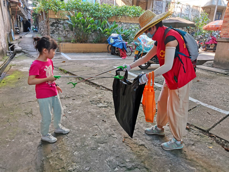 雖然他們年紀小,但是創城志愿服務的熱情卻十分高昂。李悅歌小朋友早上一到工作地點就迫不及待地去找工具,一直問媽媽我們能做什么,我們要做什么,甚至連早餐都顧不上吃。一個上午她跟隨著媽媽,對槎路社區的小廣場進行了打掃,清理了球場維修時打碎的玻璃渣子和積水區。隨后,她又跟隨著媽媽進入到小區里,撿拾居民丟棄在外面的垃圾。一開始由于個子比較小,拿的夾子有點長,她控制不好,怎么夾都夾不住那個小小的煙頭,經過她反復實驗終于掌握了力道,知道夾子靠下面的部分比較好控制,容易把物品夾起來。在掌握了竅門以后,她開啟了瘋狂“尋寶”的過程。她就像發現寶藏一樣去發現丟棄在樹葉、花圃帶、水溝里面的煙頭,甚至比志愿者姐姐和阿姨們發現的還快,每當她撿拾到煙頭,她都特別的興奮。志愿者阿姨們也從草叢里將垃圾撿拾出來,讓她負責把煙頭和垃圾放到黑色的垃圾袋里。