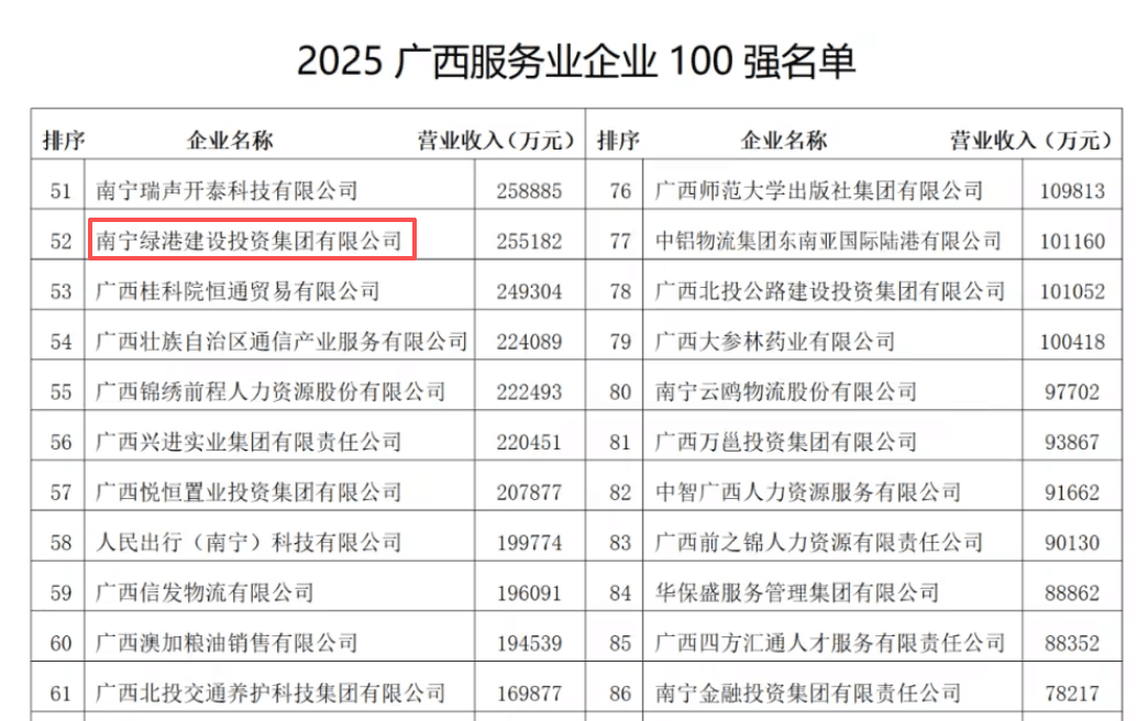 近日,廣西企業與企業家聯合會、廣西工業經濟聯合會聯合發布“2025廣西服務業企業100強”榜單。南寧五象經投集團下屬企業綠港集團憑借穩健的綜合實力、突出的發展成效,第4次榮登該榜單并位列第52位,彰顯了公司在服務區域發展、推動產業升級中的堅實底氣與強勁動能。
